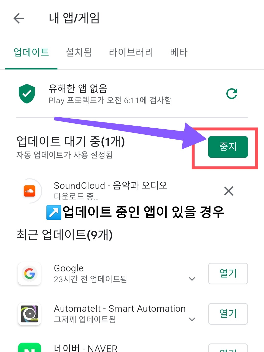 업데이트가 멈추니 자동으로 앱 다운로드를 1순위로 해서 더 빨리 다운받을 수 있다.
