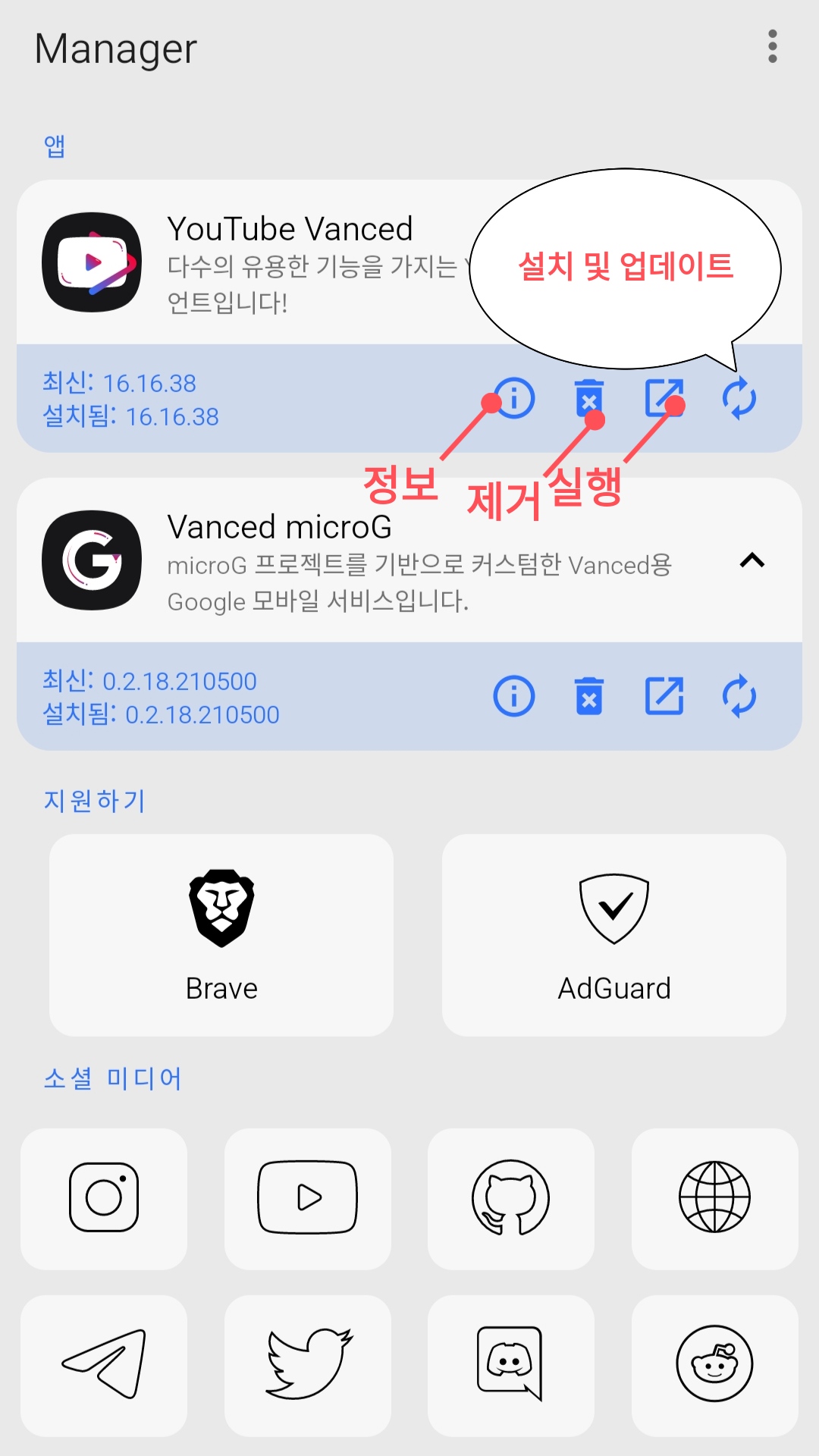설치가 완료되면 vanced manager를 열어서 microG2와 Youtube Vanced3를 설치. 구글 계정 로그인이 필요하면 무조건 microG 먼저 설치하세요.