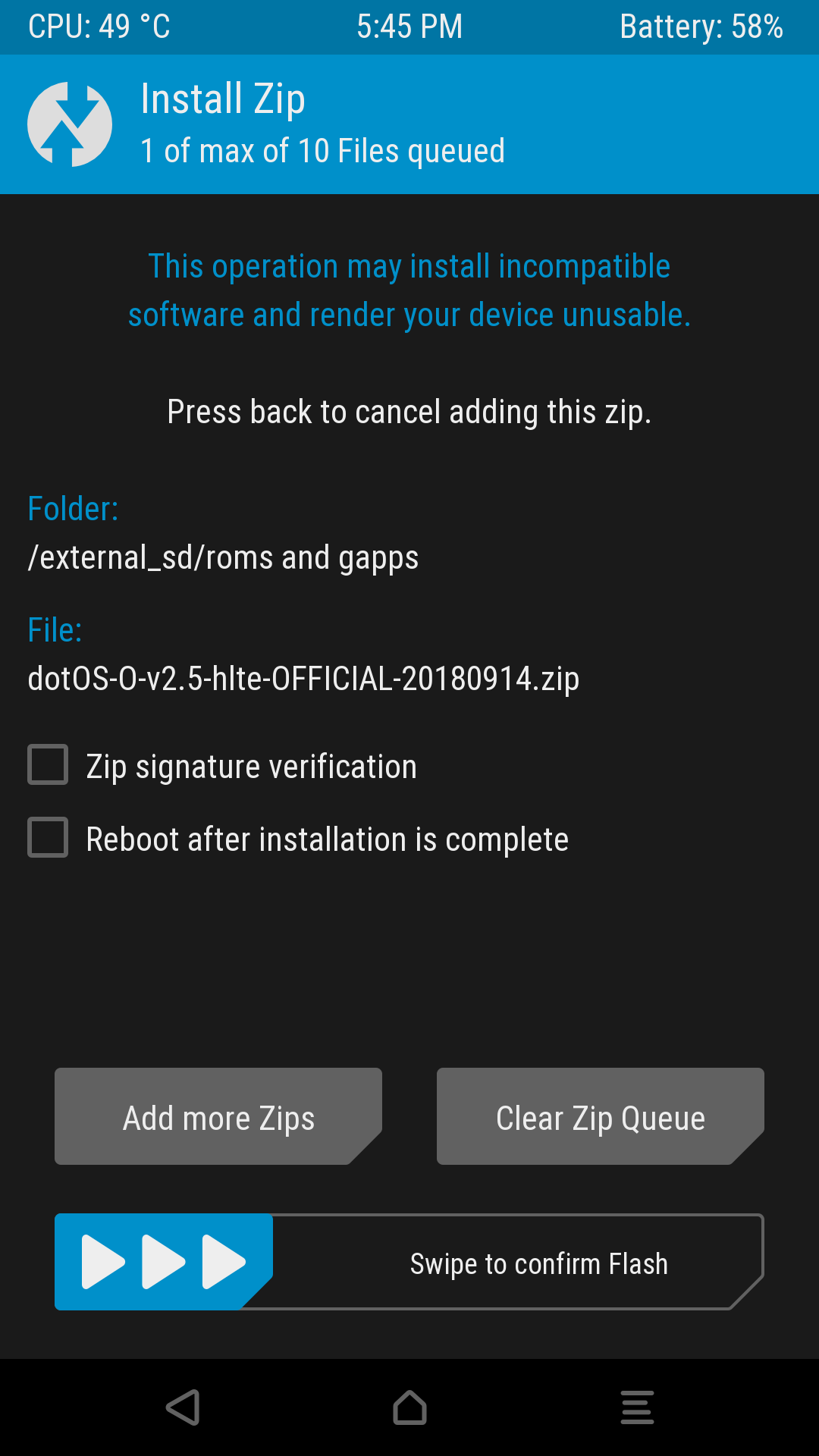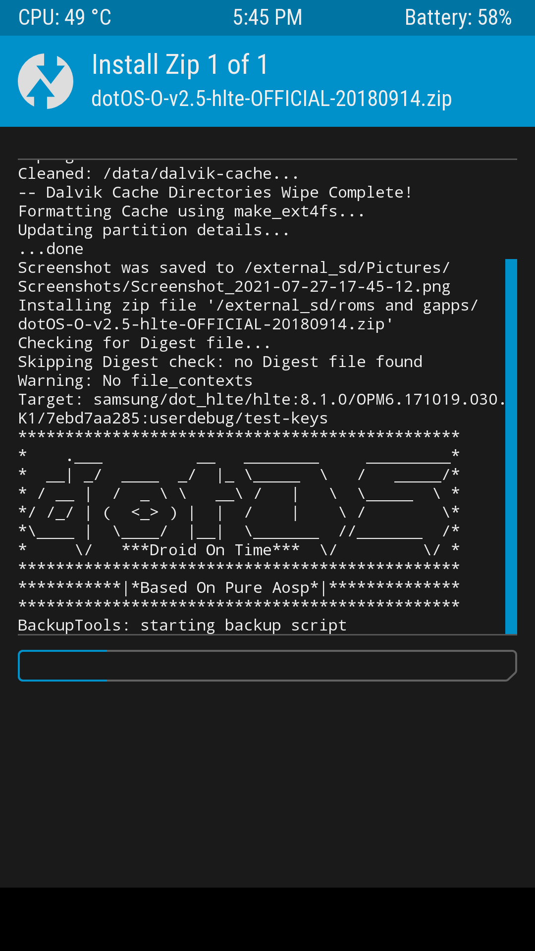 그러나 30분이 넘어도 부팅 화면이라면, 강제 종료 후 TWRP에서 다시 플래싱할 것을 고려하자