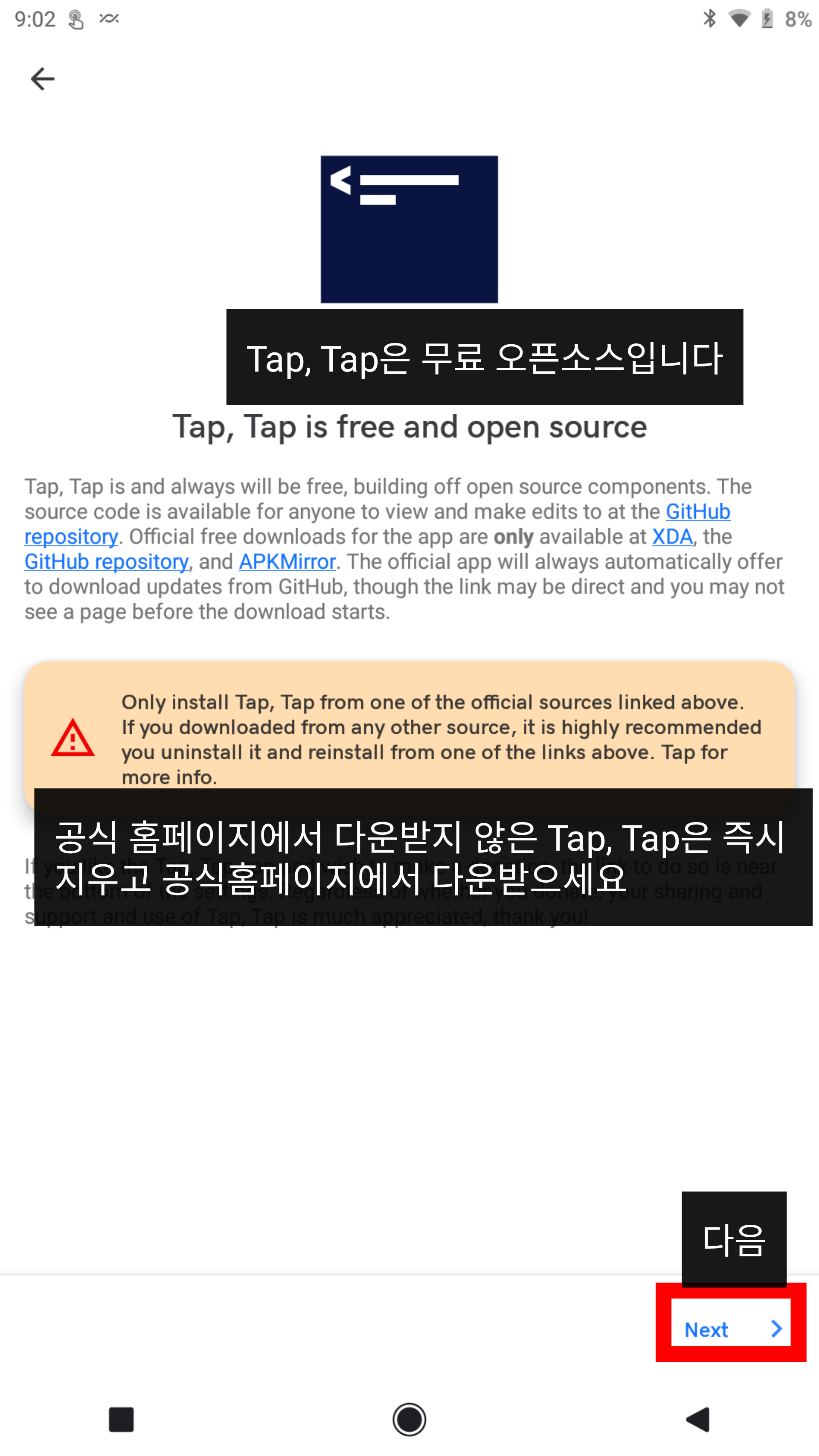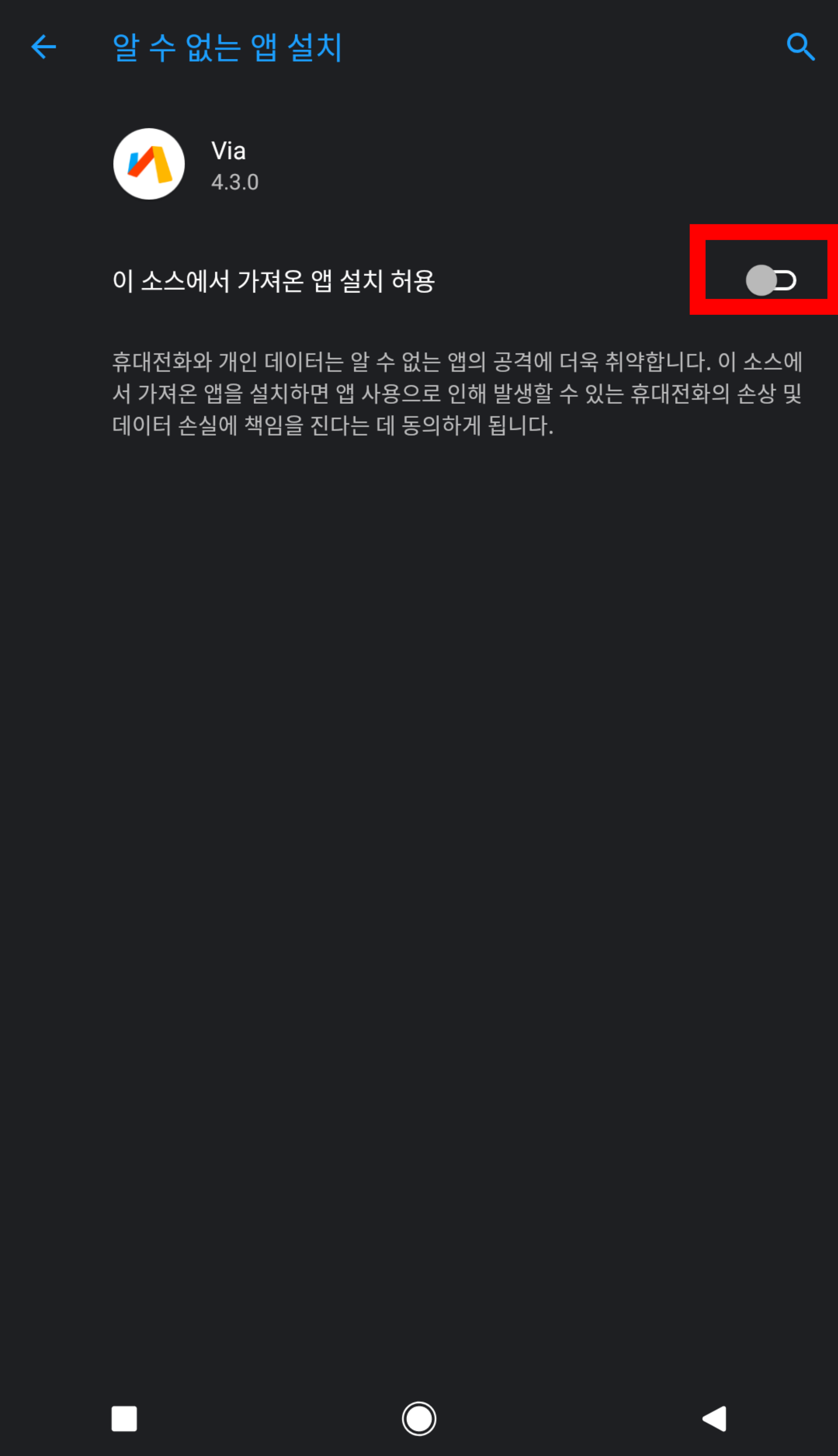 이전에 apk 파일을 다운받아보지 않으면, 보안상의 이유로 1차적으로 막는다.