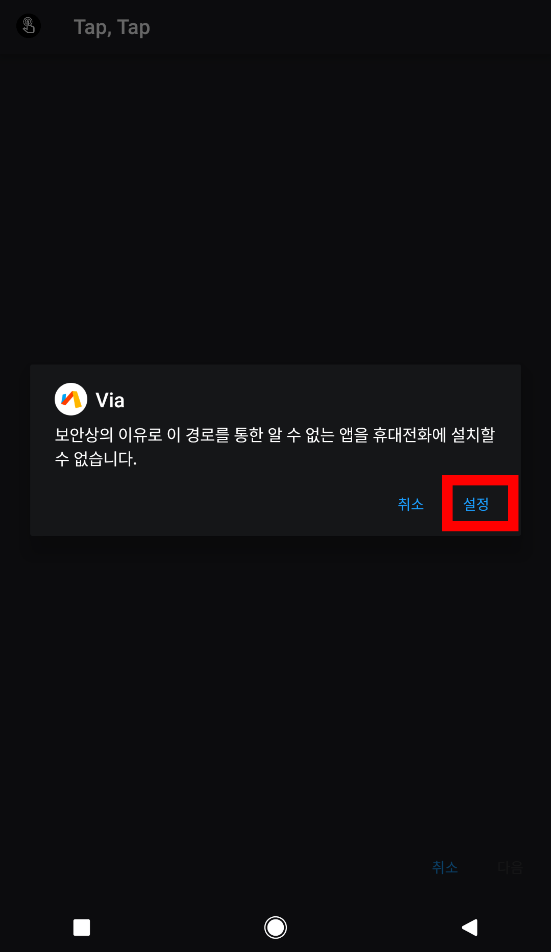 설정을 눌러서 설치 허용을 한다