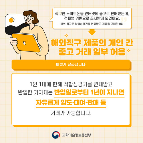 사실상 무료나눔을 제외하면 불법인 셈 입니다..그러나 곧 직구품의 중고거래가 가능해지도록 법이 개정될 예정입니다!!!