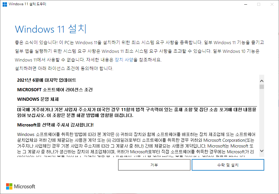 Windows 11 설치 도우미를 실행하면, 아래와 같은 화면이 나옵니다.