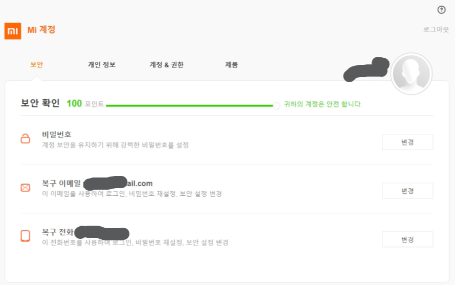 계정 이름에 마우스 올린 상태에서 MI ACCOUNT 클릭