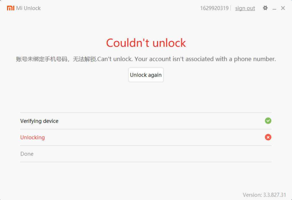 해당 Mi 계정에 전화번호가 없어서 보안성이 낮다고 판단, 언락을 막은 경우이다.