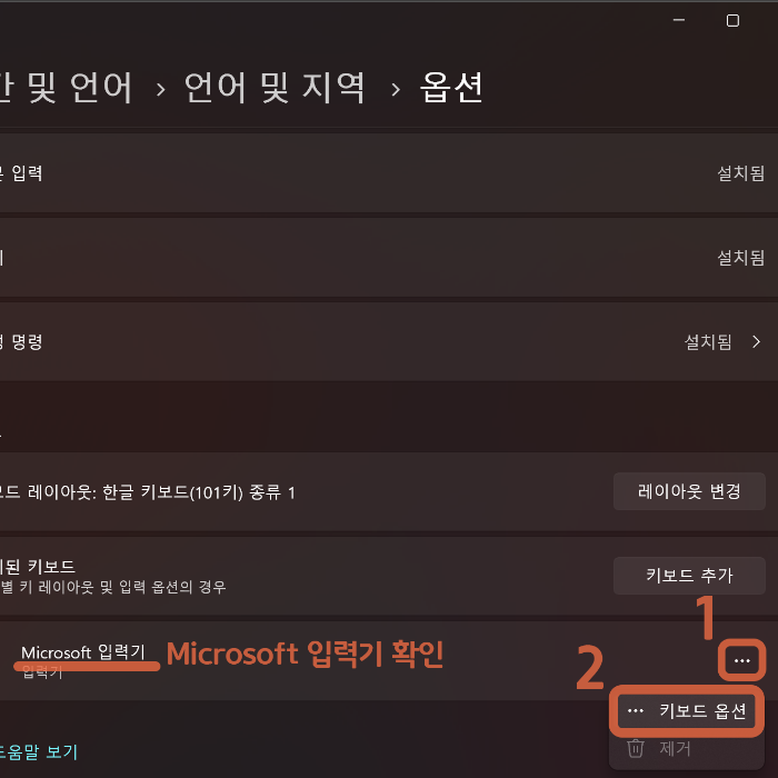'Microsoft 입력기'의 점 3개 클릭 후 '키보드 옵션' 클릭