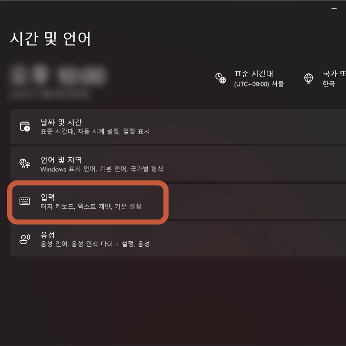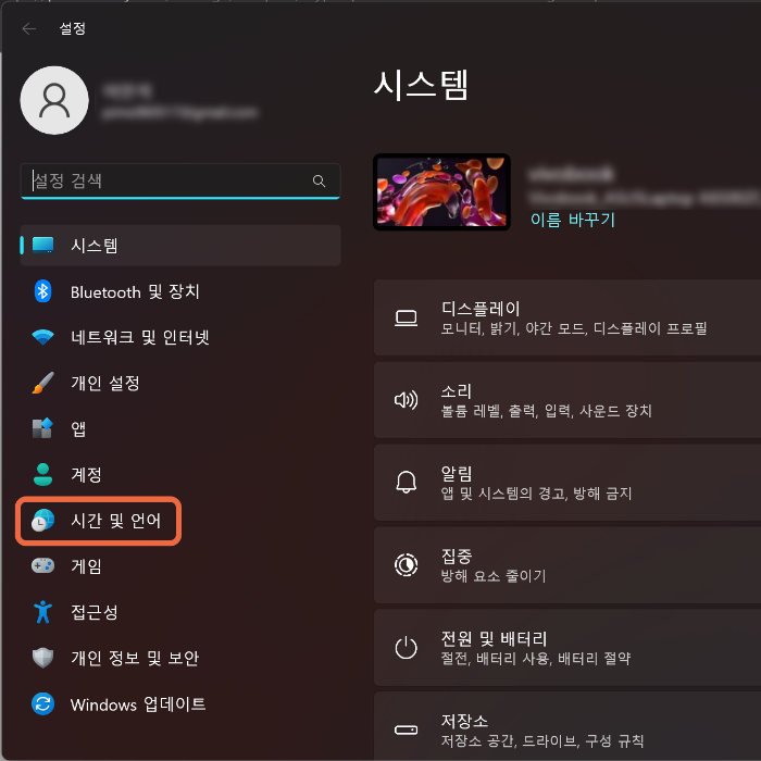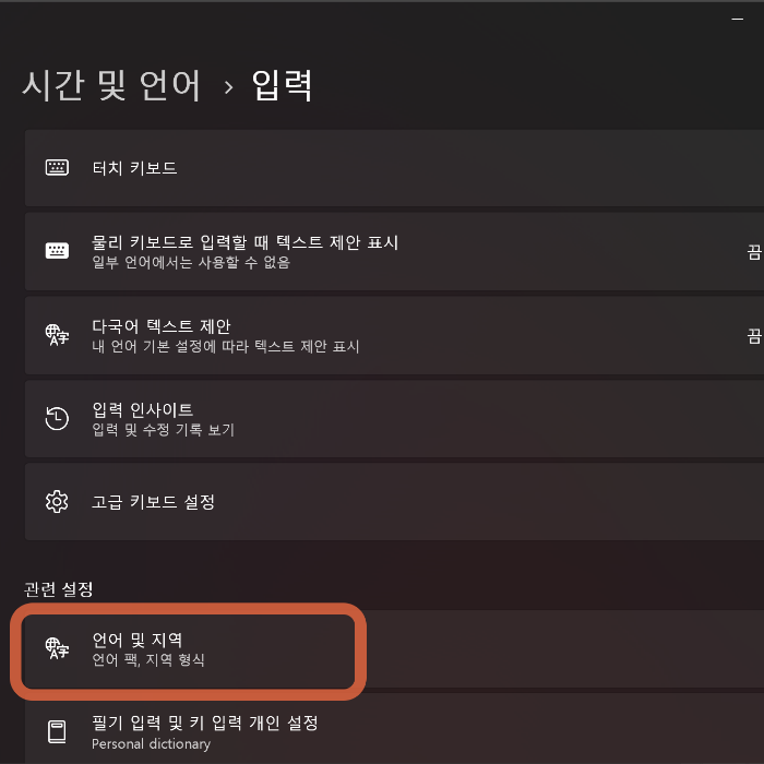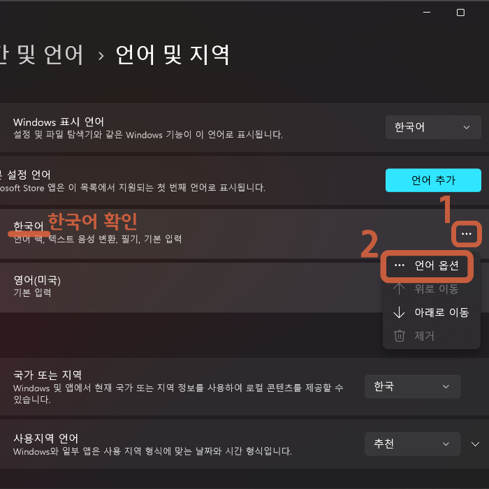 설정(윈도우 키 + i) > 시간 및 언어 > 입력 > 언어 및 지역