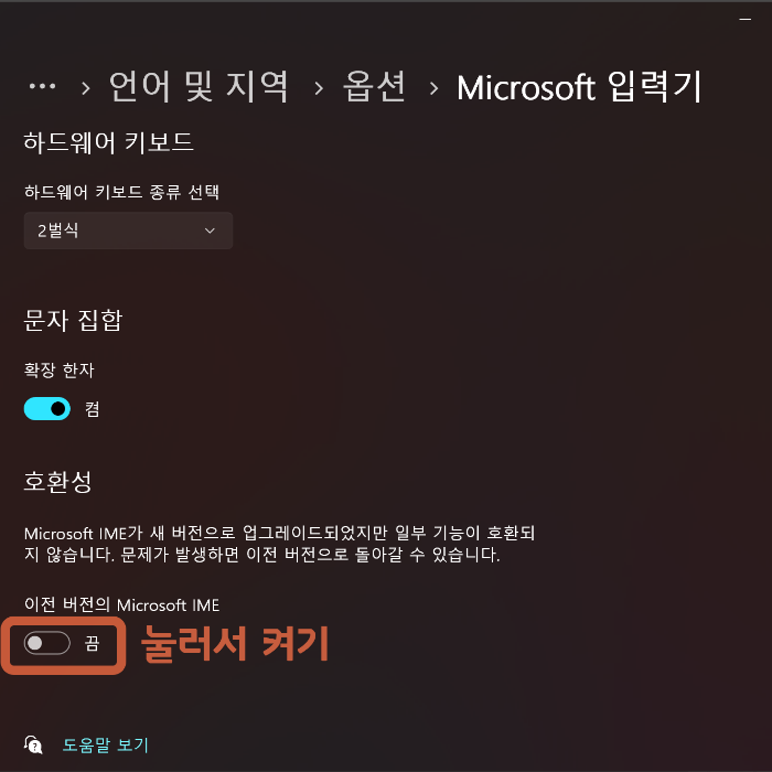Microsoft 한글 IME를 구버전으로 바꿔주면 해결됩니다