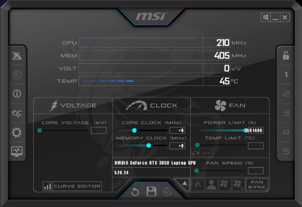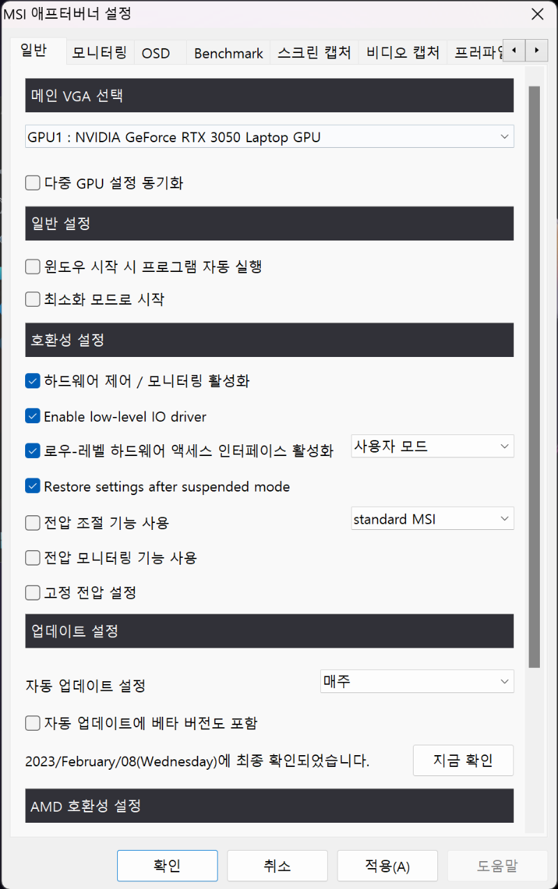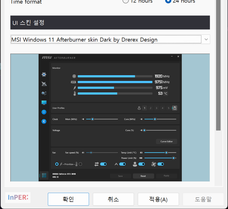 Afterburner 프로그램을 열고 왼쪽에 톱니바퀴 모양을 누르면 설정화면으로 진입합니다