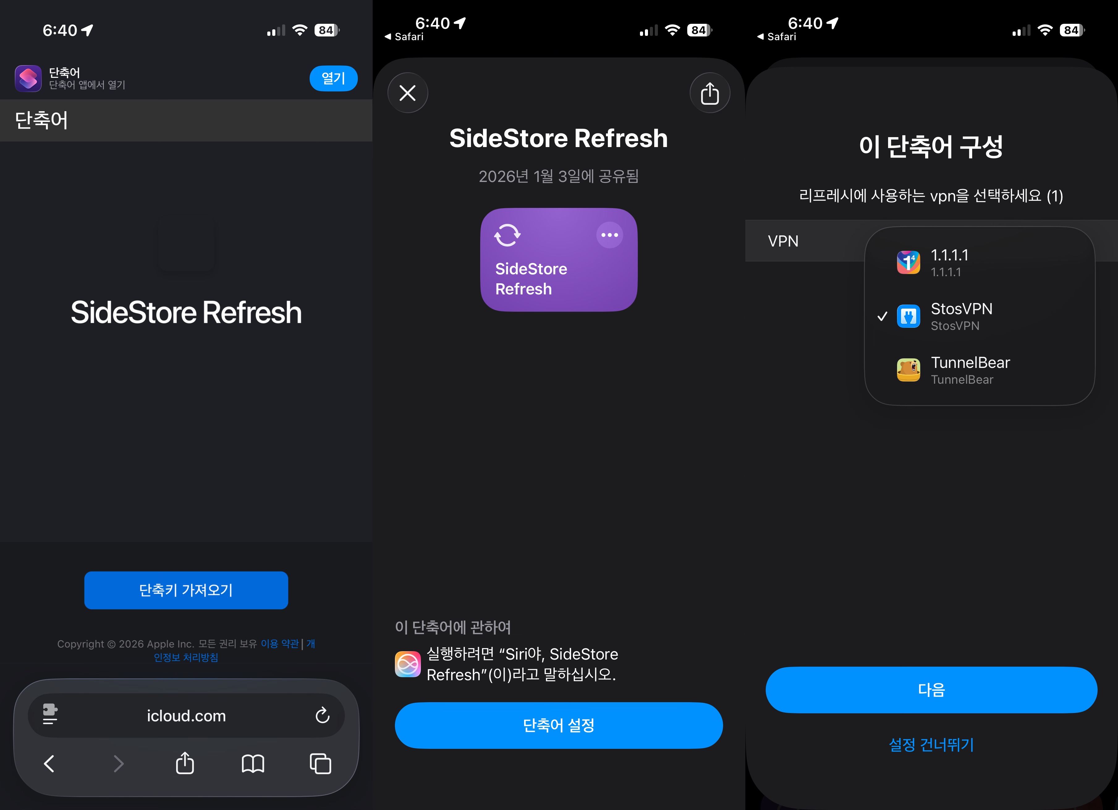 '단축어 가져오기' 클릭 > '단축어 설정' 클릭 > 리프리시에 사용하는 vpn 선택 (x2)